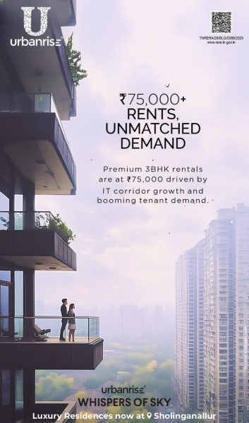 🏗 Urbanrise – Whispers of Sky, Sholinganallur\\r\\nLuxury Living Elevated Above the Ordinary\\r\\n\\r\\nNow Open for PRR / EOI | Limited Premium Residences\\r\\n\\r\\n🏡 Project Snapshot\\r\\n\\r\\nTotal Units: 623 Ultra-Premium Apartments\\r\\n\\r\\nConfigurations: Spacious 3 & 4 BHK Luxury Homes\\r\\n\\r\\nLand Parcel: 6.09 Acres of prime development\\r\\n\\r\\nStructure: 4 Iconic Towers | 2 Basements + Stilt + 24 Floors\\r\\n\\r\\nConstruction: Advanced Mivan Technology for superior strength & durability\\r\\n\\r\\nOpen Spaces: 70% Landscaped Green Area\\r\\n\\r\\nElevation Advantage: Project elevated 5 ft above road level\\r\\n\\r\\nPrivacy Assured: No common walls – complete exclusivity\\r\\n\\r\\n🌟 Sky-High Luxury Amenities\\r\\n🌊 40,000 sq.ft Rooftop Indulgence\\r\\n\\r\\nParty lawn with panoramic sea views\\r\\n\\r\\nSky lounges & premium leisure decks\\r\\n\\r\\nRooftop gardens & relaxation zones\\r\\n\\r\\n🏢 30,600 sq.ft Grand Clubhouse (G+4 Floors)\\r\\n\\r\\nTerrace swimming pool\\r\\n\\r\\nFully equipped gym & wellness suites\\r\\n\\r\\nIndoor games & mini theatre\\r\\n\\r\\nBanquet hall & party lounges\\r\\n\\r\\nDedicated work-from-home spaces\\r\\n\\r\\n🎯 100+ Lifestyle Amenities\\r\\n\\r\\nPickleball Academy\\r\\n\\r\\nMitawaki forest walkway\\r\\n\\r\\nZen gardens & themed landscapes\\r\\n\\r\\nMulti-sport courts\\r\\n\\r\\nKids’ play zones & senior citizen areas\\r\\n\\r\\nPet-friendly parks\\r\\n\\r\\nUrbanrise Genius: Learning & development hub for children\\r\\n\\r\\n📍 Strategic Location – Sholinganallur\\r\\n\\r\\nJust 1 km from upcoming Metro Station\\r\\n\\r\\nSeamless connectivity to OMR & IT Corridor\\r\\n\\r\\nClose to top schools, hospitals & entertainment hubs\\r\\n\\r\\n🏠 Unit Configurations & Pricing (PRR / EOI)\\r\\n\\r\\nRegular 3 BHK (2T) 1239 sqft ₹1.05 – ₹1.12 Cr\\r\\n\\r\\nPrime 3 BHK (3T) 1590 sqft ₹1.35 – ₹1.43 Cr\\r\\n\\r\\nGrand Large 3 BHK (3T) 1756 sqft ₹1.49 – ₹1.58 Cr\\r\\n\\r\\nElite 4 BHK 2144 sqft ₹1.82 – ₹1.93 Cr\\r\\n\\r\\n💰 PRR / EOI Options\\r\\n\\r\\nGolden: ₹2,00,000 (Refundable)\\r\\n\\r\\nPlatinum: ₹5,00,000 (Non-refundable – Priority Unit Selection)\\r\\n\\r\\n✨ Why Choose Urbanrise – Whispers of Sky\\r\\n\\r\\n✔ Advanced Mivan construction\\r\\n✔ Sea-view rooftop lifestyle\\r\\n✔ 70% open green spaces\\r\\n✔ Smart-home ready residences\\r\\n✔ Prime OMR – Sholinganallur location..